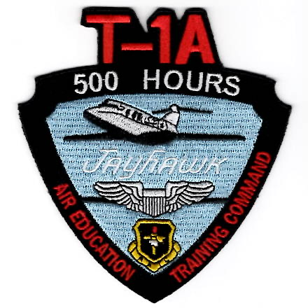 The Raytheon T-1 Jayhawk is a twin-engined jet aircraft used by the US Air Force for advanced pilot training. T-1A students go on to fly airlift and tanker aircraft. The T-400 is a similar version for the Japan Air Self-Defense Force. This patch commemorates those who log 500+ hours in this aircraft and does not come with Velcro.