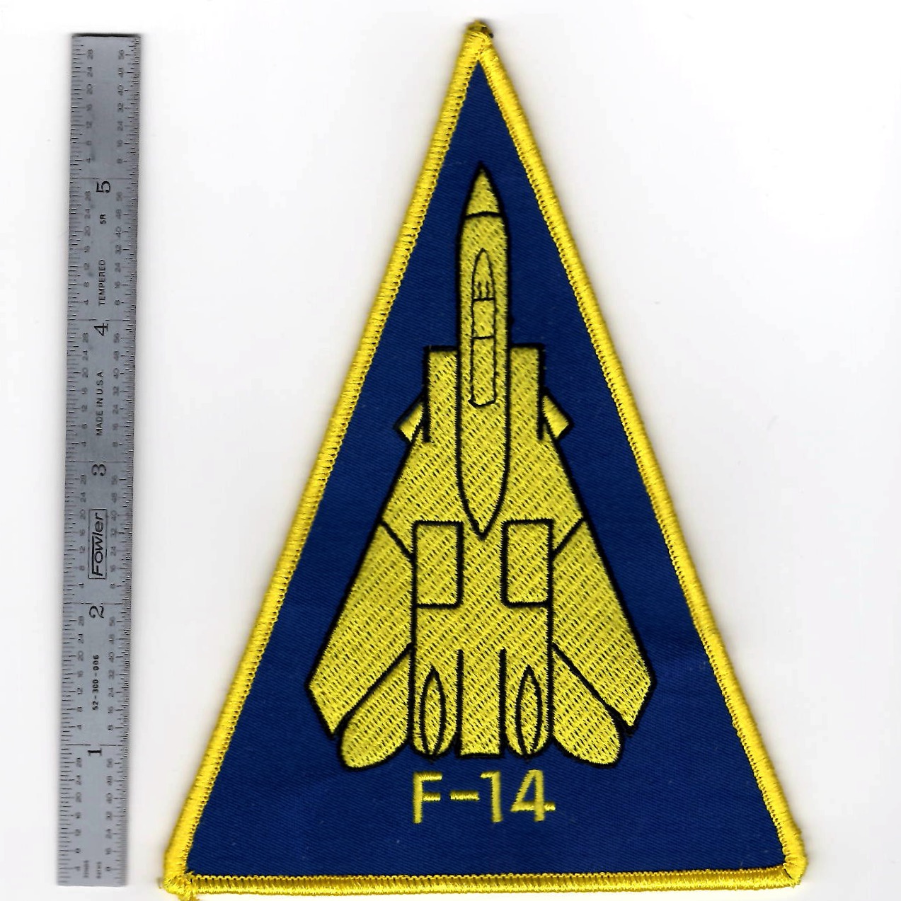 This is the very large, blue/yellow version of the F-14 Tomcat Triangle patch used in the movie, TOPGUN, worn on the right sleeve (top) of GOOSE’ NOMEX jacket. This patch does not come with velcro attached.