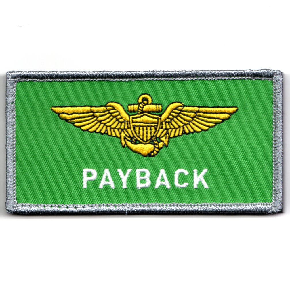 This is the (callsign only) nametag for “PAYBACK” (already embroidered) that was used in the movie, TOPGUN:MAVERICK. It was worn on the left breast area of the flight suit and does have velcro attached so that it can be put onto your flightsuit or flight jacket. We typically only wore these “callsign” nametags on Fridays.