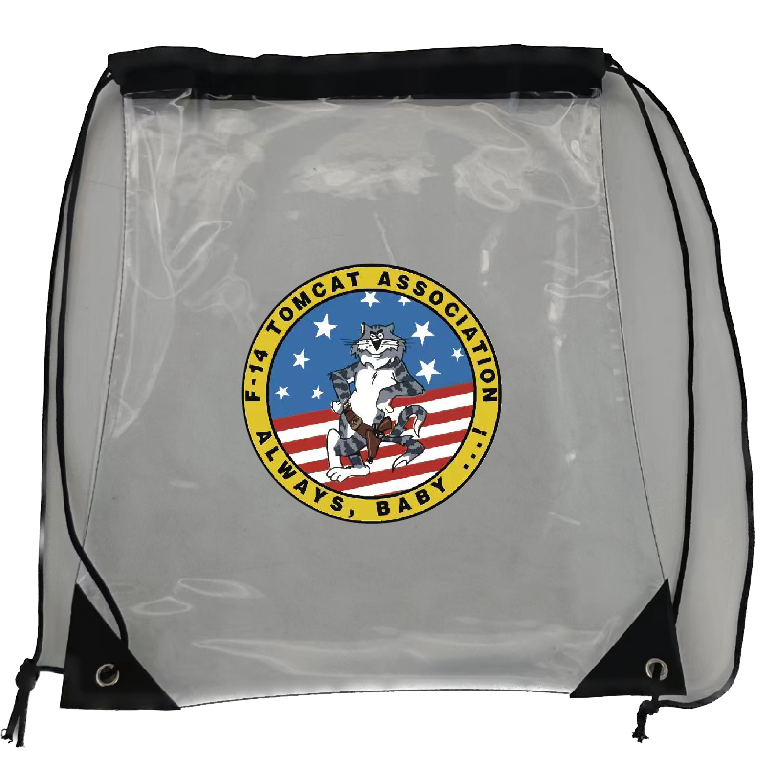 This is CLEAR (not gray, as seen in the picture), plastic backpack with the black drawstrings created for the 2024 Tomcat Association Reunion in DFW, TX. They had to be clear to meet the “tour requirements” when everyone went on a tour of certain facilities. We made it “generic” with the Tomcat Association logo……