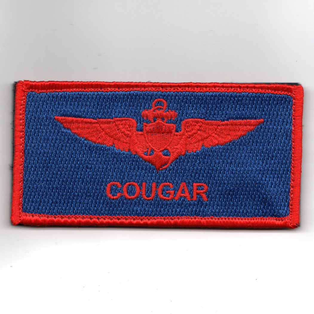 This is the red-blue version of ‘COUGAR’s nametag from the movie TOPGUN. It can be worn on the left breast area of the flight suit and does have velcro attached.