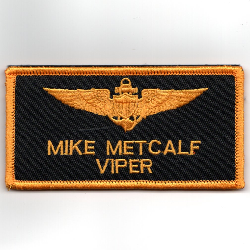 This is the DARK YELLOW version of CDR MIKE METCALF’s (callsign ‘VIPER’) nametag (already embroidered) that was used in the movie, TOPGUN. It was worn on the left breast area of the flight suit and does NOT have velcro attached so it can be sewn onto the flight suit or jacket.
