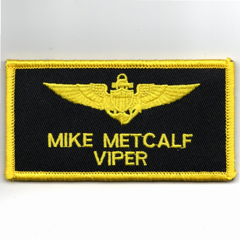 This is the LIGHT YELLOW version of CDR MIKE METCALF’s (callsign ‘VIPER’) nametag (already embroidered) that was used in the movie, TOPGUN. It was worn on the left breast area of the flight suit and DOES have velcro attached so it can be worn on the flight suit or jacket.