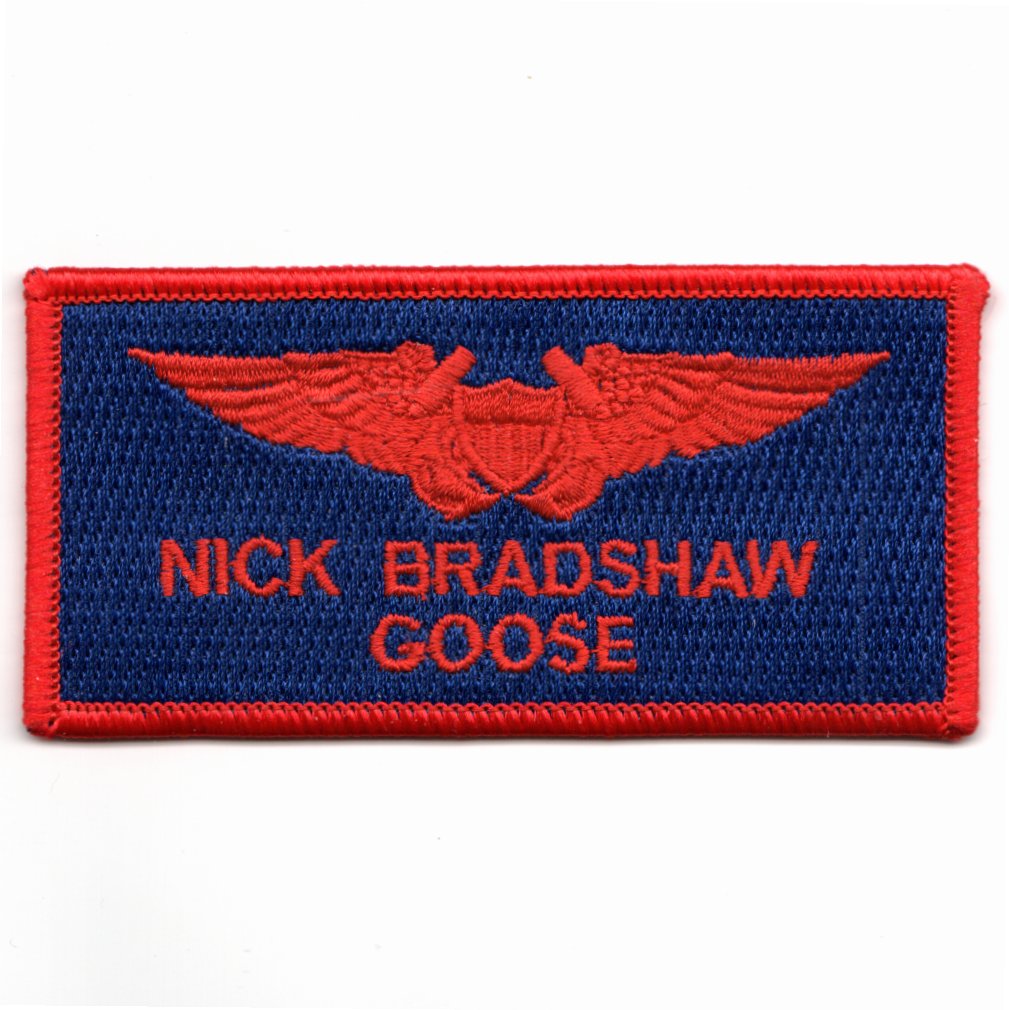 This is the red/blue version of NICK BRADSHAW’s (callsign “GOOSE”) nametag (already embroidered) that was used in the movie, TOPGUN. It was worn on the left breast area of the flight suit and does NOT have velcro attached so that it can be sewn onto your flightsuit or flight jacket.