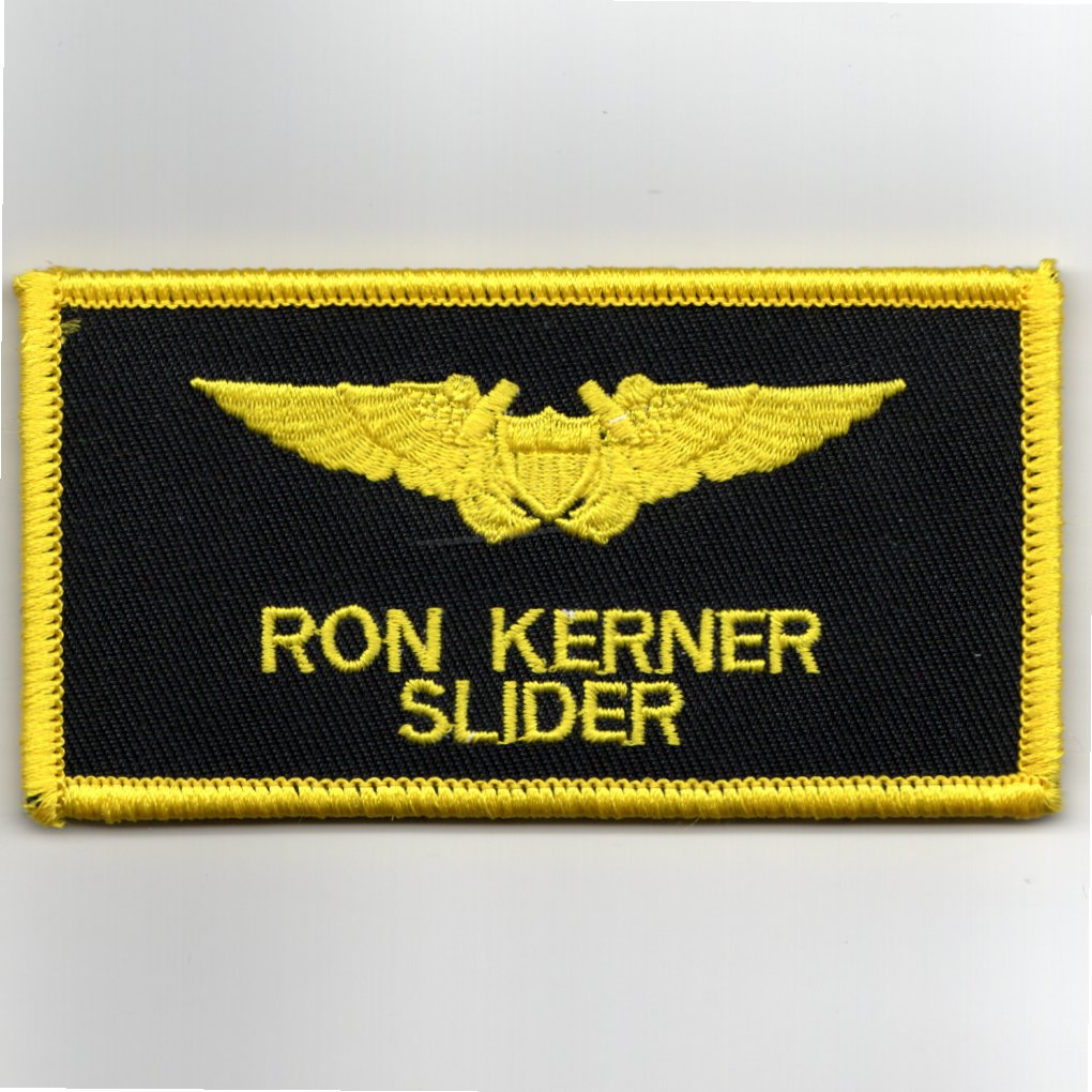 This is the LIGHT Yellow version of RON KERNER’s nametag (callsign ‘SLIDER’, already embroidered) that was used in the movie, TOPGUN. It was worn on the left breast area of the flight suit and does NOT have velcro attached so that it can be sewn onto your flightsuit or flight jacket.