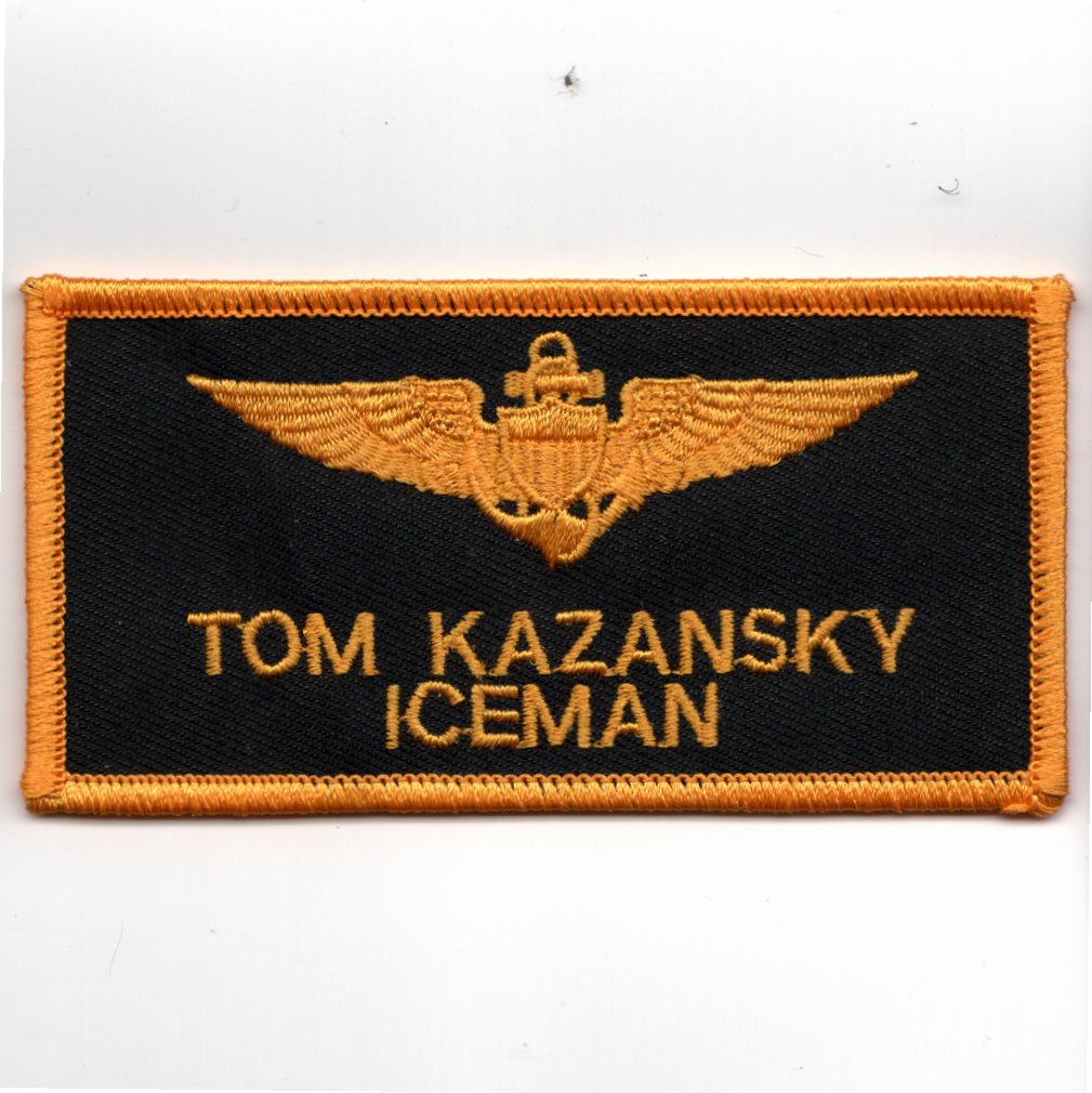 This is the DARK yellow version of TOM KAZANSKI’s nametag (callsign, ‘ICEMAN’ already embroidered) that was used in the movie, TOPGUN. It was worn on the left breast area of the flight suit and does NOT have velcro attached so that it can be sewn onto your flightsuit or flight jacket.