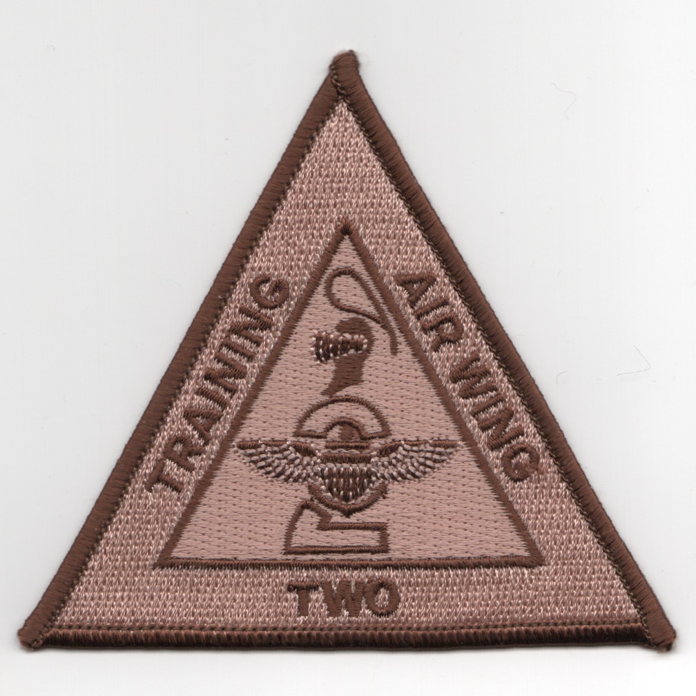 Training Air Wing TWO (TW-2 or TRAWING 2) is a US Navy aircraft training air wing based aboard NAS Kingsville, in Kingsville, Texas. TW-2 is one of five training air wings in the NATC, and consists of two jet training squadrons. The wing trains Student Naval Aviators from the U.S. Navy, U.S. Marine Corps, and international allies. Following completion of primary flight training and selection of an advanced training pipeline, Student Naval Aviators are assigned to TW-2 for either intermediate and advanced strike pipeline training or advanced E-2/C-2 training in the T-45C Goshawk jet training aircraft. This is the desert version of the wing patch for Training Wing 2 and does NOT come with velcro attached.