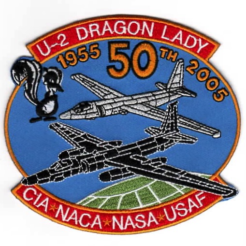 This is the 50th Anniversary patch created for the U-2 “Dragon Lady”. It has the dates of 1955 – 2005 (top) and says “CIA * NACA * NASA * USAF” along the bottom with the gray and black versions of the U-2 aircraft, along with the Lockheed SKUNKWORKS logo. This patch does not have velcro attached.