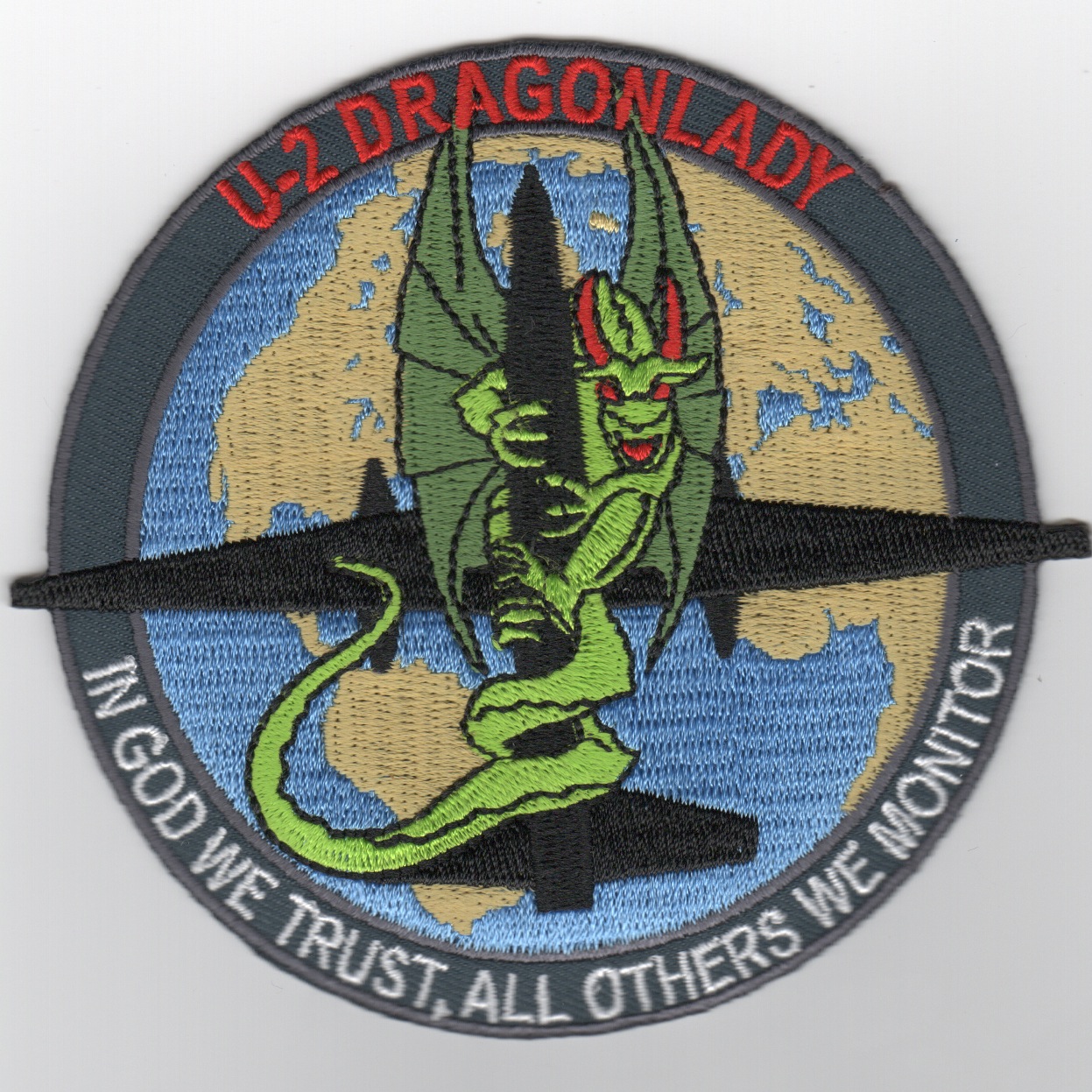 This is the U-2 Dragon Lady patch that states “In God We Trust, All Others We Monitor”. It shows the “dragon” on the aircraft….
