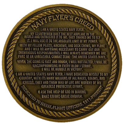 This is the U.S. NAVAL AVIATION coin that has the Naval Flight Officer (NFO) wings and tailhook on the front and the NAVY FLYER’S CREED on the back (see below).