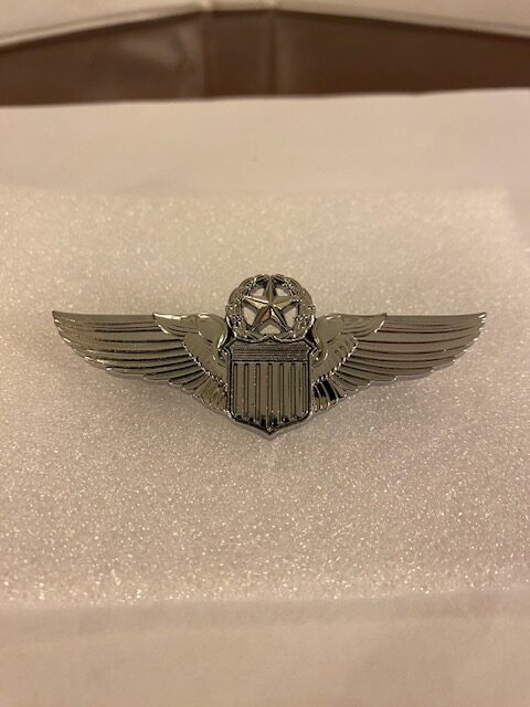 USAF aeronautical badges, commonly referred to as “wings” from their shape and their historical legacy, are awarded by the Air Force in recognition of degrees of achievement and experience. Officers earning these badges and maintaining their requirements are classified as rated officers and receive additional pay and allowance. This is the “large” version of the USAF “COMMAND” Pilot rating worn on the Service Dress Uniform.