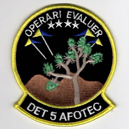 Detachment 5 is located at Edwards AFB, CA. The detachment conducts operational test and evaluation of bomber, tanker, flight training, airlift, special operations, unmanned aircraft systems, and specific intelligence, surveillance, and reconnaissance (ISR), command, control, and communications (C3) aircraft and systems. Detachment 5 conducts operational test and evaluation of warfighter systems in operationally realistic battlespace environments to determine their effectiveness, suitability, and mission capability. Detachment 5Õs co-location with the Air Force Test Center provides unique opportunities for integrated developmental and operational test synergy. This version of their patch says *OPERARI EVALUER* (top) and does not come with velcro attached.