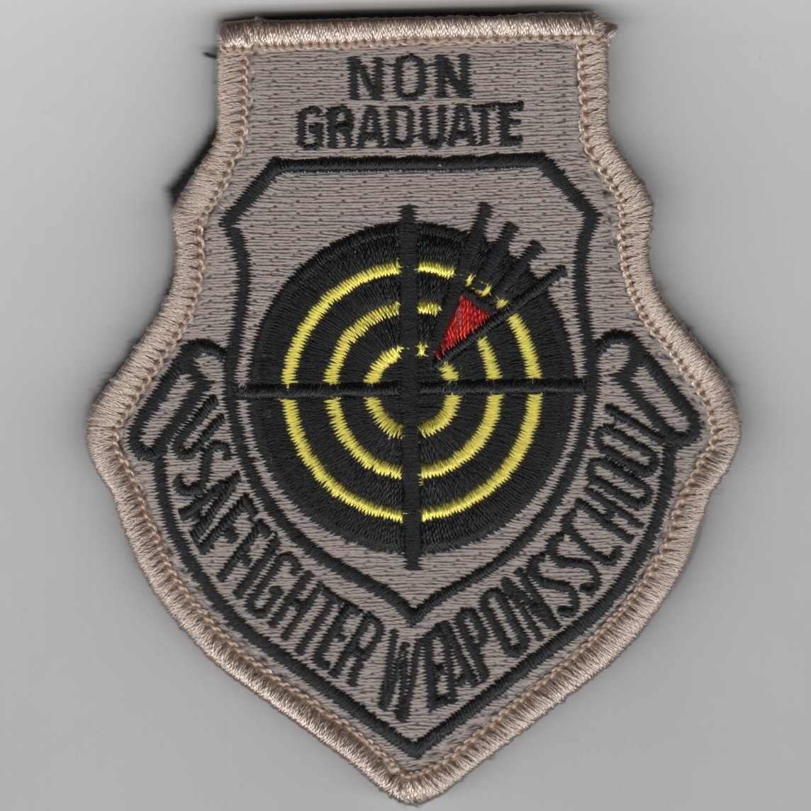 This is the version of the USAF Fighter Weapons School NON-GRADUATE patch that states “USAF Fighter Weapons School” in the standard color. However, this patch says “NON Graduate” at the top and shows the arrow slightly off target in the middle. This patch does not come with velcro.