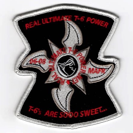 On July 31, 2000 another tenant unit joined Moody AFB, GA when the 479th Flying Training Group (FTG), an Air Education and Training Command (AETC) unit, was activated at Moody AFB to conduct the Introduction to Fighter Fundamentals (IFF) course and the Joint Specialized Undergraduate Pilot Training (JSUPT) courses flying the AT-38B “Talon” aircraft and the T-6 “Texan.” By October 2001, the 479FTG consisted of the 49th Flying Training Squadron (FTS), the 3rd Flying Training Squadron (FTS), the 39th Flying Training Squadron (FTS), and the 435th Flying Training Squadron (FTS). This is the Class patch for JSUPT Class 06-08 and says ‘REAL ULTIMATE T-6 POWER / 06-08 MAFIA”. This patch does not come with velcro attached.