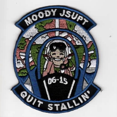 On July 31, 2000 another tenant unit joined Moody AFB, GA when the 479th Flying Training Group (FTG), an Air Education and Training Command (AETC) unit, was activated at Moody AFB to conduct the Introduction to Fighter Fundamentals (IFF) course and the Joint Specialized Undergraduate Pilot Training (JSUPT) courses flying the AT-38B “Talon” aircraft and the T-6 “Texan.” By October 2001, the 479FTG consisted of the 49th Flying Training Squadron (FTS), the 3rd Flying Training Squadron (FTS), the 39th Flying Training Squadron (FTS), and the 435th Flying Training Squadron (FTS). This is the “blue bordered” version (for the USAF students) Class patch for JSUPT Class 06-15 and says ‘QUIT STALLIN”. This patch does not come with velcro attached.