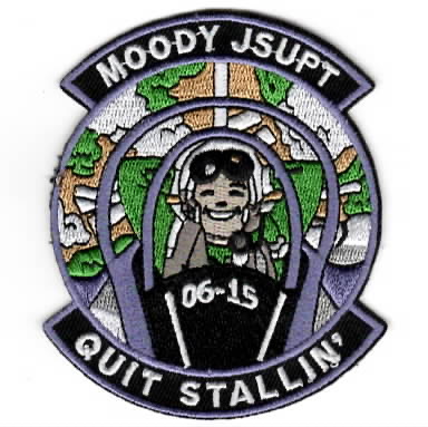 On July 31, 2000 another tenant unit joined Moody AFB, GA when the 479th Flying Training Group (FTG), an Air Education and Training Command (AETC) unit, was activated at Moody AFB to conduct the Introduction to Fighter Fundamentals (IFF) course and the Joint Specialized Undergraduate Pilot Training (JSUPT) courses flying the AT-38B “Talon” aircraft and the T-6 “Texan.” By October 2001, the 479FTG consisted of the 49th Flying Training Squadron (FTS), the 3rd Flying Training Squadron (FTS), the 39th Flying Training Squadron (FTS), and the 435th Flying Training Squadron (FTS). This is the “purple bordered” version (for the JOINT students) Class patch for JSUPT Class 06-15 and says ‘QUIT STALLIN”. This patch does not come with velcro attached.