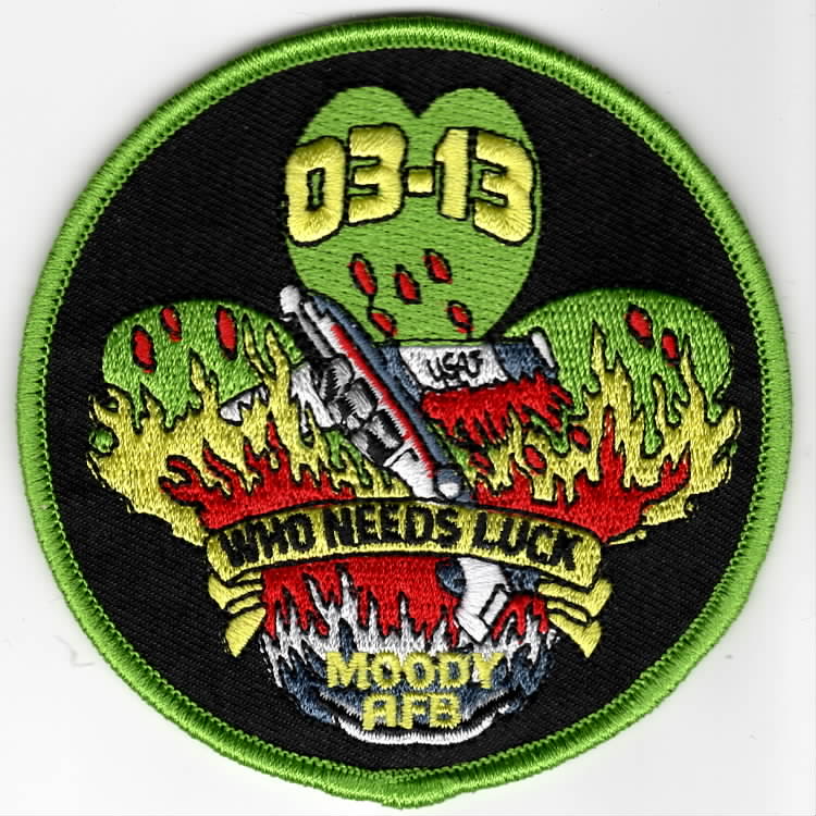 On July 31, 2000 another tenant unit joined Moody AFB, GA when the 479th Flying Training Group (FTG), an Air Education and Training Command (AETC) unit, was activated at Moody AFB to conduct the Introduction to Fighter Fundamentals (IFF) course and the Joint Specialized Undergraduate Pilot Training (JSUPT) courses flying the AT-38B “Talon” aircraft and the T-6 “Texan.” By October 2001, the 479FTG consisted of the 49th Flying Training Squadron (FTS), the 3rd Flying Training Squadron (FTS), the 39th Flying Training Squadron (FTS), and the 435th Flying Training Squadron (FTS). This is the Class patch for UPT Class 03-13 and says “WHO NEEDS LUCK”. This patch does not come with velcro attached.