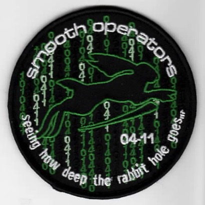 This is the class patch created for US Air Force Undergraduate Pilot Training (UPT) Class 04-11. The “MATRIX” movies were popular then, and this design was inspired by those movies. It says “SMOOTH OPERATORS” (top), “SEEING HOW DEEP THE RABBIT HOLE GOES” (bottom), and shows the numbers in green/black in vertical descension…..this patch does not come with velcro attached.
