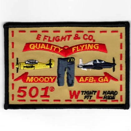 This is the class patch created for US Air Force Undergraduate Pilot Training (UPT) Class 05-01. It says “”””E FLIGHT”””” (top) and shows both the yellow and black/white aircraft..this patch does not come with velcro attached.