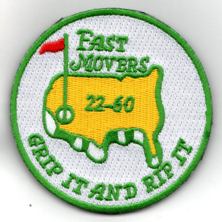 (Another AV8RSTUFF Creation): This is the class ‘bullet’ patch for the USAF Undergraduate Pilot Training (UPT) class 22-60. It is designed after the PGA “MASTERS” logo, says “FAST MOVERS” (top), “GRIP IT and RIP IT” (bottom), but has the ‘hole’ location on the WEST COAST instead of Augusta, GA….and does have velcro attached.
