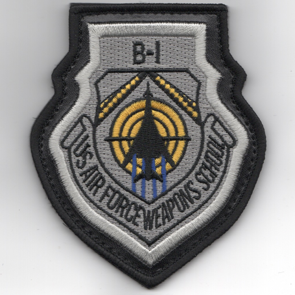 This is the leather-bordered version of the USAF Weapons School B-1B Division patch worn on the leather flight jacket. It shows the “Lancer” Planform in the center of the patch, says US AIR FORCE WEAPONS SCHOOL (bottom), and DOES have velcro attached.