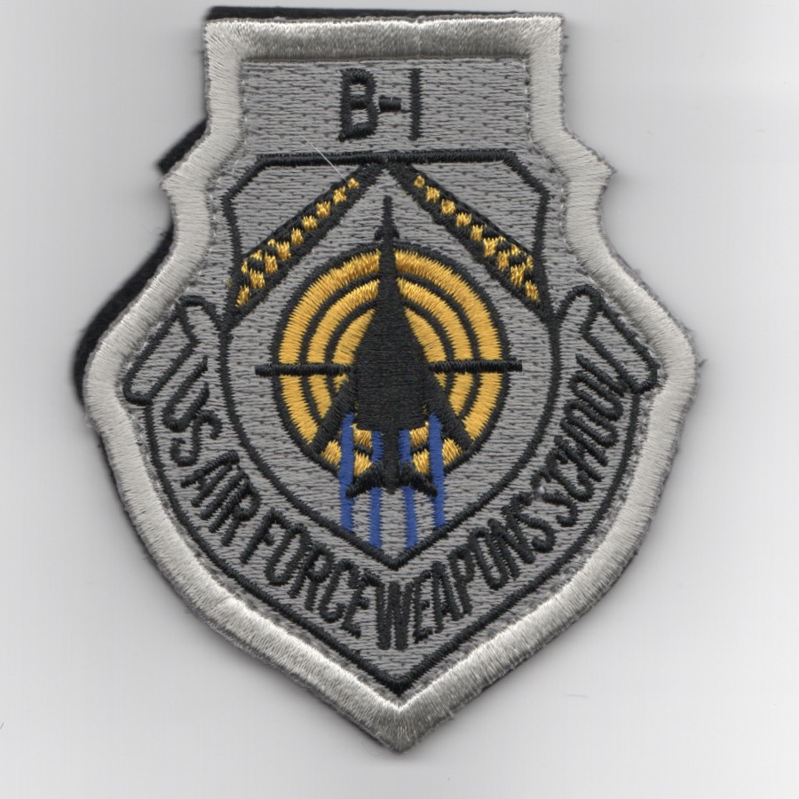 This is the WHITE-bordered version of the USAF Weapons School B-1B Division patch worn on the leather flight jacket. It shows the “Lancer” Planform in the center of the patch, says US AIR FORCE WEAPONS SCHOOL (bottom), and DOES have velcro attached.