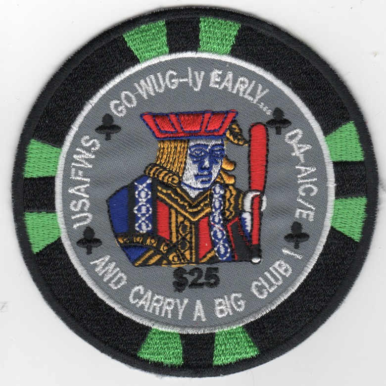 This is the class patch for ‘Class 04 AIC/E’ that attended the US Air Force Weapons School (WIC) course at Nellis AFB, NV. It says “GO WUG-LY EARLY’ and does not have velcro attached.