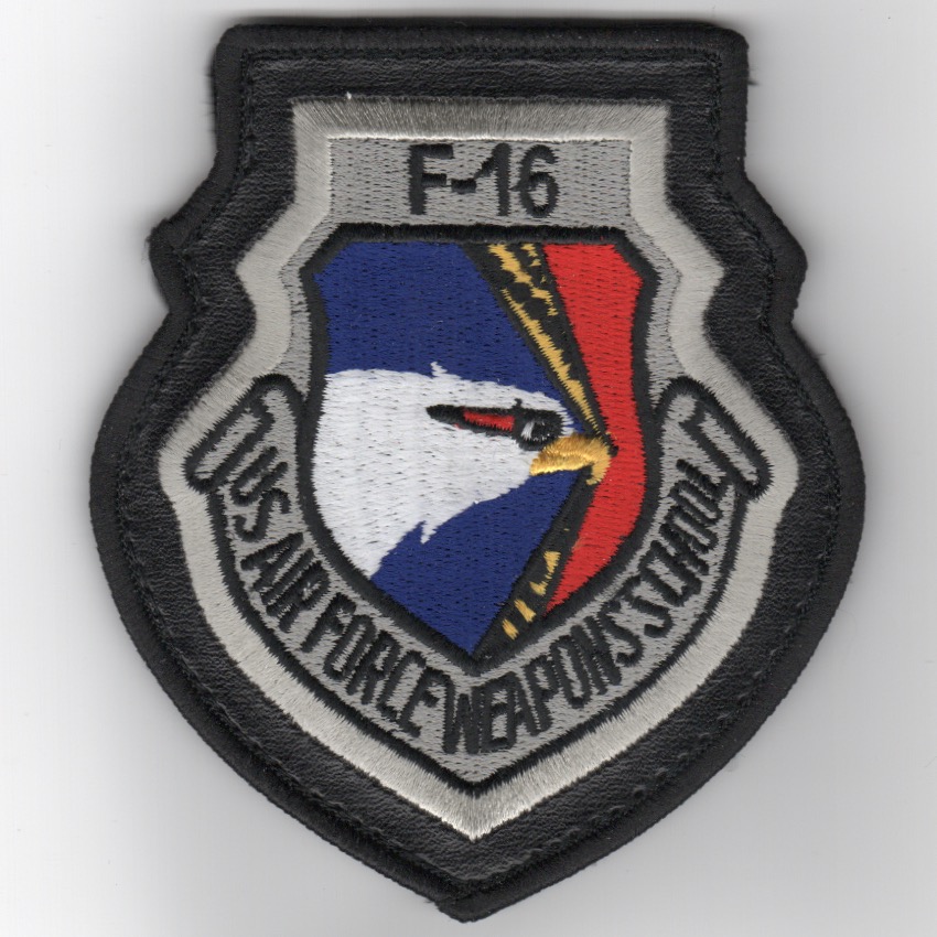 This is the leather-bordered version of the USAF Weapons School F-16 Division patch worn on the leather flight jacket. It shows the side view of the “”””Falcon-head”””” in the center of the patch. This patch does have velcro attached.