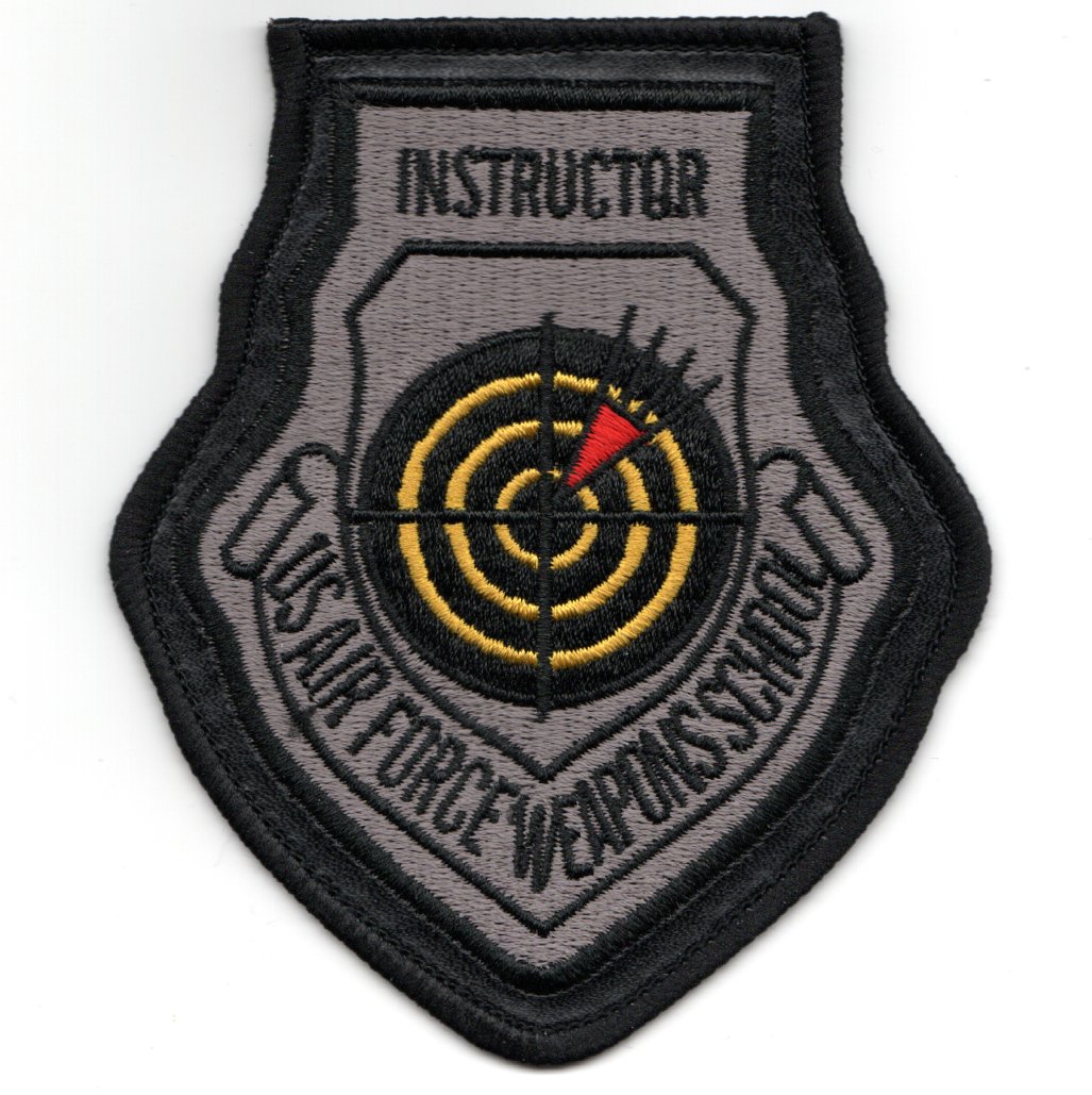 This is the leather-bordered version of the USAF Weapons School INSTRUCTOR patch that says “”””US Air Force Weapons School”””” along the bottom and “”””INSTRUCTOR”””” at the top in the standard gray color. This version does NOT come with velcro attached.