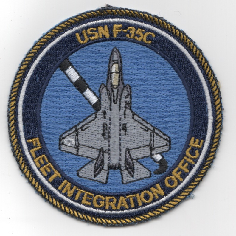 This is the blue version of the USN’s F-35C ‘Fleet Integration Office’ bullet patch worn by those tasked with the implementation of this aircraft into the Naval Aviation fleet. It does not come with velcro attached.