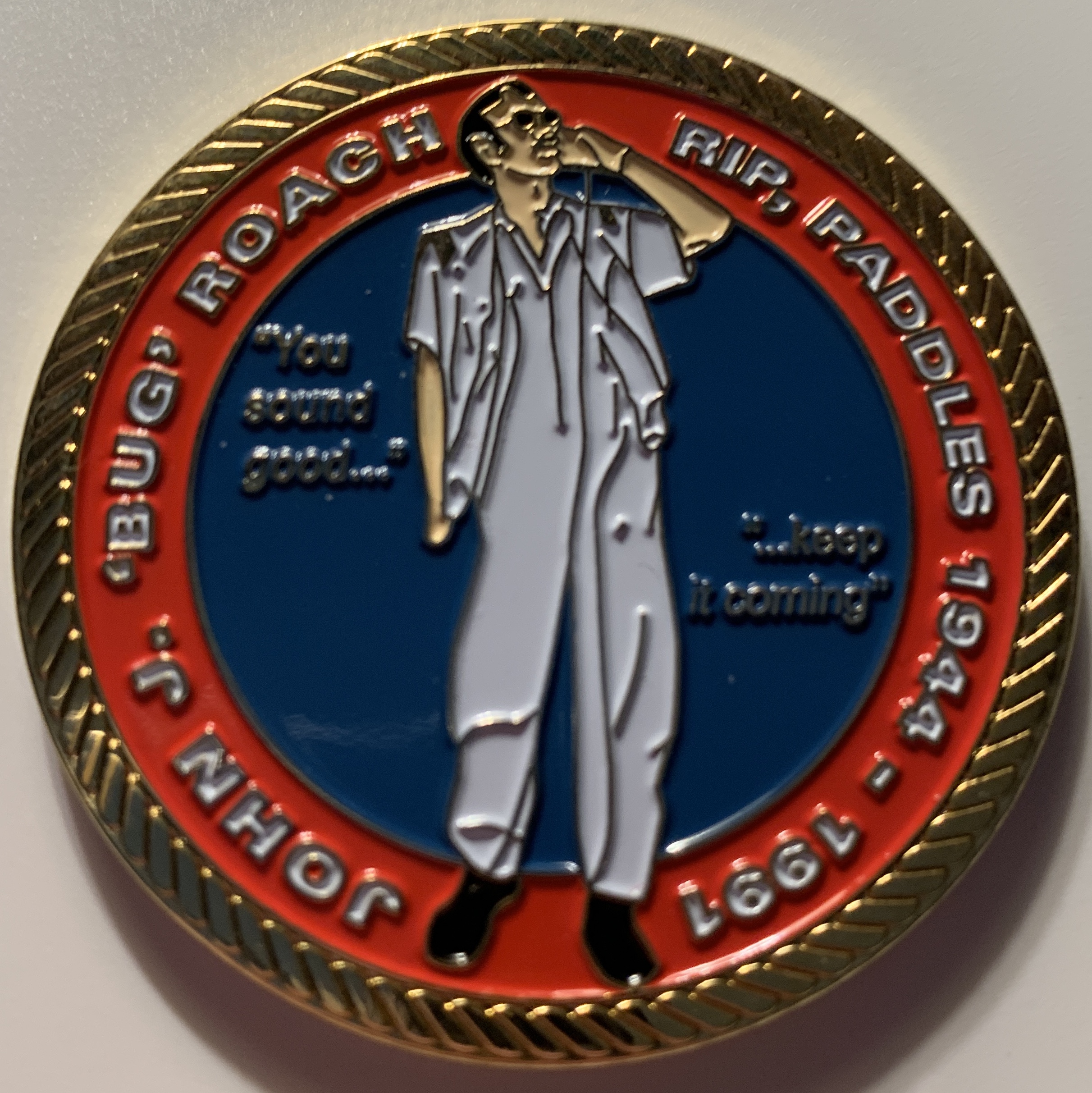 Another “IRISH””” creation: This is the commemorative ‘Challenge Coin’ created for CDR John J. ‘BUG’ Roach’s career. CDR Roach was the Navy’s senior LSO. He “waved” more aircraft than any other LSO in the Navy (over 130,000 landings). Recognizing CDR Roach’s enormous contribution to naval aviation, the Northern California Coastal Navy League established the Commander John “Bug” Roach Paddles Award for LSO excellence. There is a picture of him on the front (seen here) and the back of the coin can be seen below.