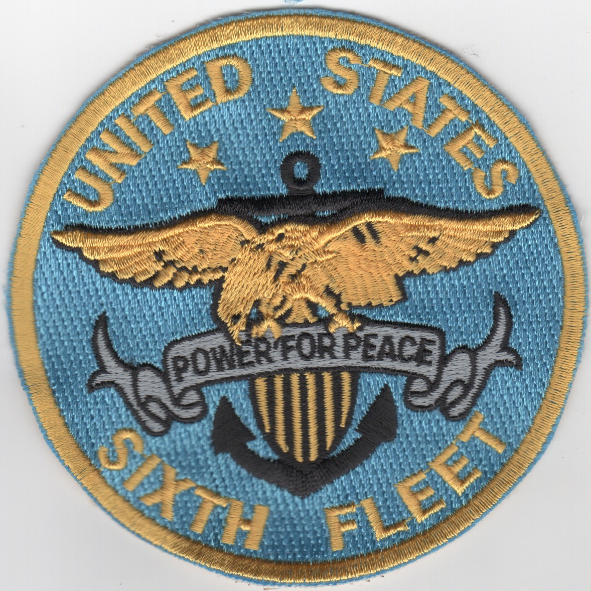The Sixth Fleet is the US Navy’s operational fleet of US Naval Forces Europe headquartered at Naval Support Activity Naples, Italy. The officially stated mission of the Sixth Fleet in 2011 is that it “conducts the full range of Maritime Operations and Theater Security Cooperation missions, in concert with coalition, joint, interagency, and other parties, in order to advance security and stability in Europe and Africa.” The Sixth Fleet was established in February 1950 by redesignation of the former Sixth Task Fleet and since that time, it has been continually engaged in world affairs around the Mediterranean. It was involved in numerous NATO maritime exercises, the U.S. Lebanese intervention of 1958, confrontation with the Soviets during the Yom Kippur War (also known as the October War) of 1973, clearance of the Suez Canal after 1973, and several confrontations with Libya during the 1980s (including Operation El Dorado Canyon). Most recently it launched airstrikes on Libya again during the Libyan Civil War of 2011. This is the light blue version of their unit patch and does not have velcro attached.