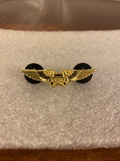The Naval Flight Officer insignia is a breast insignia of the United States military which is awarded to those aviators of the Navy, Marine Corps and Coast Guard who have qualified as Naval Flight Officers (NFO) based on successful completion of flight training. The insignia is similar in design to the Naval Aviator insignia, consisting of a pair of golden wings, a shield, and crossed anchors. The Naval Flight Officer insignia is identical for both branches and is awarded in a single degree. To qualify for the NFO insignia, a service member must have completed officer aviation training and be qualified as a systems operator on board a Naval aircraft. Such qualifications include weapons system operations, airborne tactical data system operations, electronic warfare, and airborne navigation. This is the “miniature” version worn on the Service Dress Uniform.