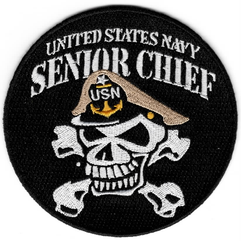 This is the version of the US Navy SENIOR Chief’s patch that shows the Skull wearing his KHAKI-colored “”””COMBO COVER”””” on a round/black patch. This patch does not come with velcro attached.