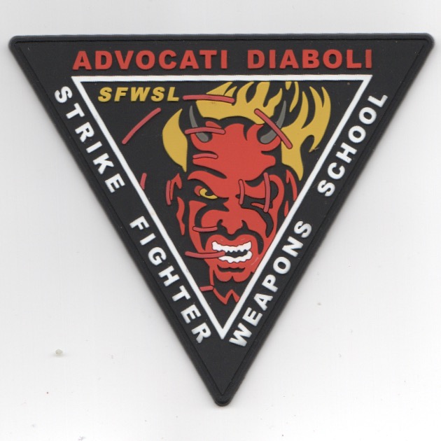 This is the black-bordered version of the PVC/rubber version of the triangle patch for the Strike Fighter Weapons School, Atlantic for the F/A-18 Hornet and (formerly for) the F-14 Tomcat located at NAS Oceana, VA. When the schools combined, the officers got together to brainstorm a new design and command motto. Across the top of the triangle patch it says “Advocati Diaboli”, loosely translates to “Devil’s Advocates”. Being that they fly aggressor missions for the fleet, they are in a sense, the Devil’s advocates. We “argue” the opposite side of a point to prove it’s validity. With that motto accepted the FA- 18 officers wanted to preserve the F-14 heritage in the new school since the Strike Fighter name was staying and the F-14 was decommissioned. The obvious choice was the decommissioned F-14 squadron, VF-74 Bedevilers. With a redesigned Devil replacing the old bomb site with the missle site from the “Top Gun” Fighter Weapons School design the new patch was formed. This patch does not have velcro.