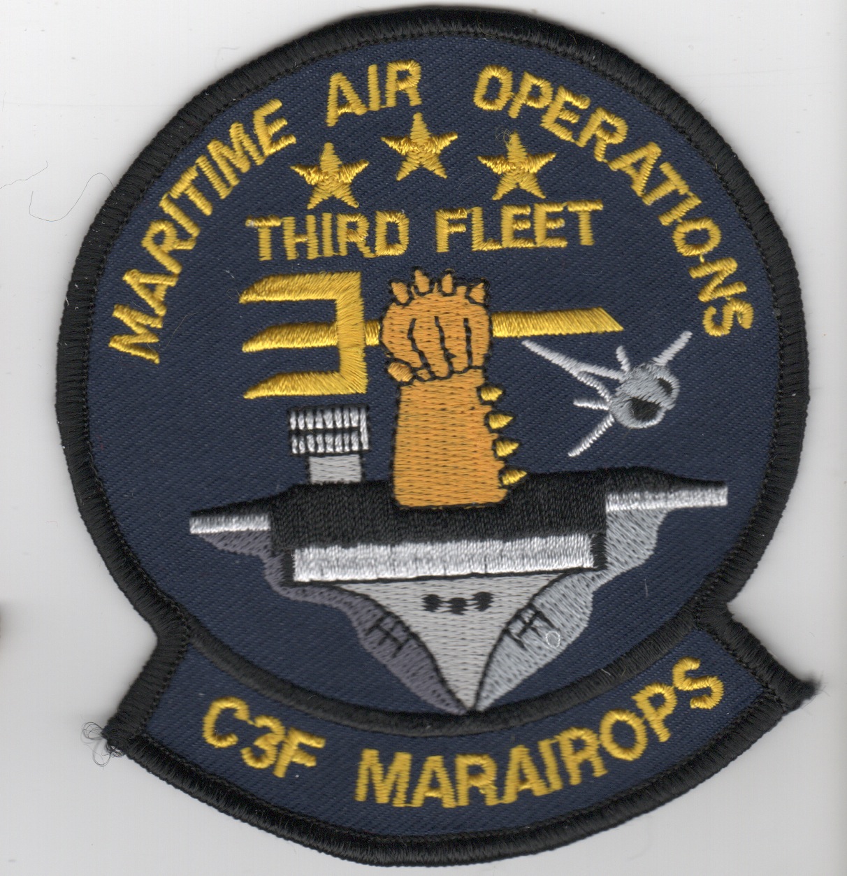 The Third Fleet is one of six numbered fleets in the United States Navy. Third Fleet’s area of responsibility includes approximately fifty million square miles of the eastern and northern Pacific ocean areas including the Bering Sea, Alaska, the Aleutian Islands and a sector of the Arctic. Major oil and trade sea lines of communication within this area are critically important to the economic health of the United States and friendly nations throughout the Pacific Rim region. First established in 1943, the Third Fleet conducted extensive operations against Japanese forces in the Central Pacific during World War II. Deactivated in 1945, the fleet remained inactive until 1973, when it was reactivated and assumed its current responsibilities. This patch was created for their “C3F” MAR AIR OPS. It does not have velcro attached.