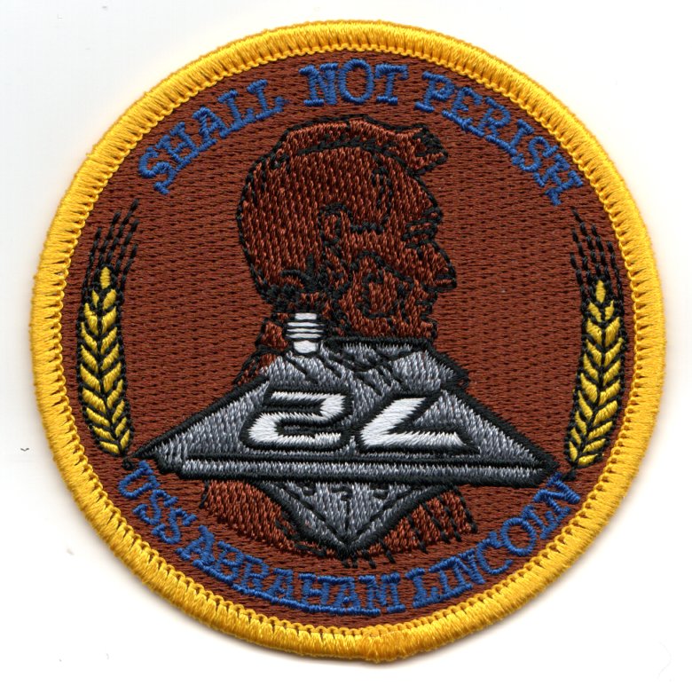 The keel for the carrier named in honor of America’s 16th President was laid on 3 November 1984, launched on 13 February 1988, and commissioned on 11 November 1989. Previously, the Fleet Ballistic Missile Submarine (SSBN) 602 carried the name. She deployed on a WestPac/Arabian Gulf deployment on 11 June 1998 for her regularly scheduled rotation, then returned on 7 December 1998 to her home port of Everett, WA. This is the medium-sized version of the ship patch and does not come with velcro attached.