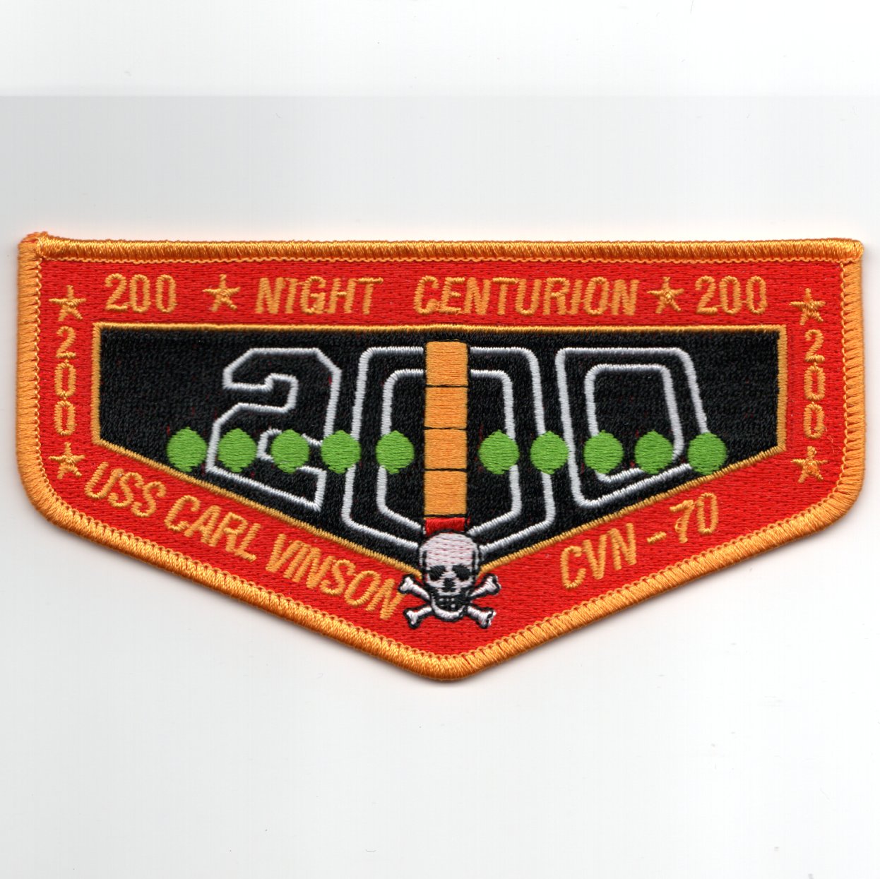 The Navy’s fourth nuclear-powered carrier is named for the late congressman from the great State of Georgia. The keel for the “Starship Vinson” was laid on 11 October 1975, launched on 15 March 1980, and commissioned on 13 March 1982. Her home-port is Puget Sound Naval Shipyard in Bremerton, WA. She deployed late 1998 on a WestPac/ Arabian Gulf cruise, and returned in May of 1999 to her home-port. This is the “flap” patch for getting 200 NIGHT traps onboard CVN-70 and does not come with velcro attached.