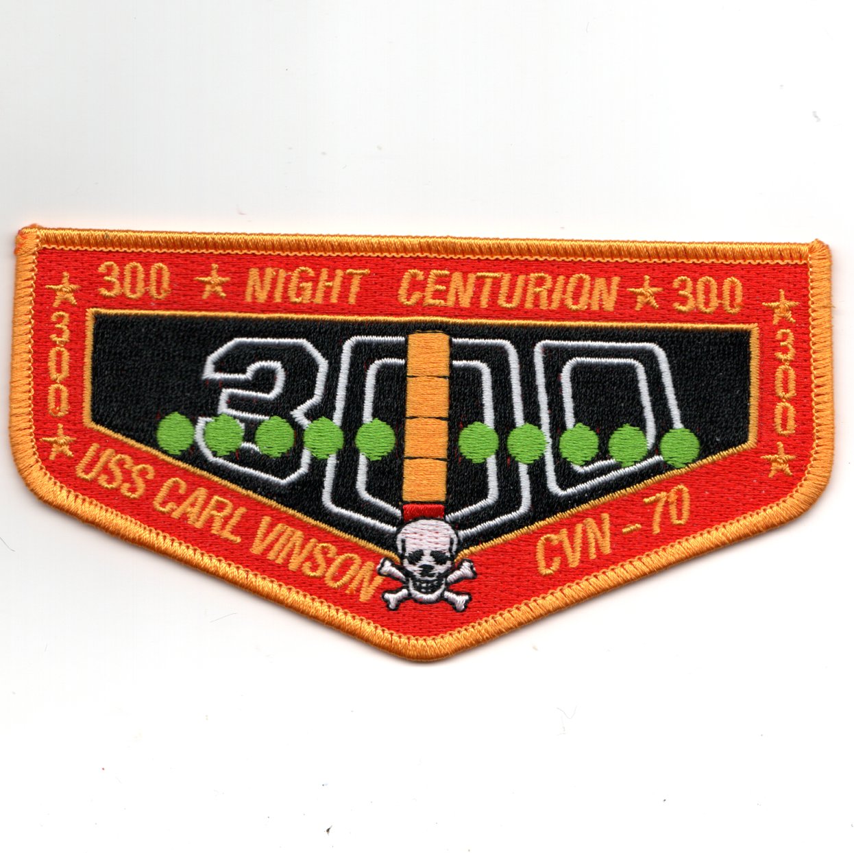 The Navy’s fourth nuclear-powered carrier is named for the late congressman from the great State of Georgia. The keel for the “Starship Vinson” was laid on 11 October 1975, launched on 15 March 1980, and commissioned on 13 March 1982. Her home-port is Puget Sound Naval Shipyard in Bremerton, WA. She deployed late 1998 on a WestPac/ Arabian Gulf cruise, and returned in May of 1999 to her home-port. This is the “flap” patch for getting 300 NIGHT traps onboard CVN-70 and does not come with velcro attached.