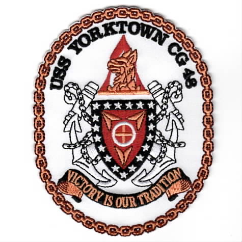 This is the “ship” patch for the USS YORKTOWN (CG 48). On the 1985/86 Aircraft Carrier deployment for USS ENTERPRISE (CVN-65) with Air Wing Eleven (CVW-11), the YORKTOWN conducted operations in the Black Sea which VF-213 supported (in real life). That is the reason this patch was chosen for the ICEMAN leather jacket and does not come with velcro attached.