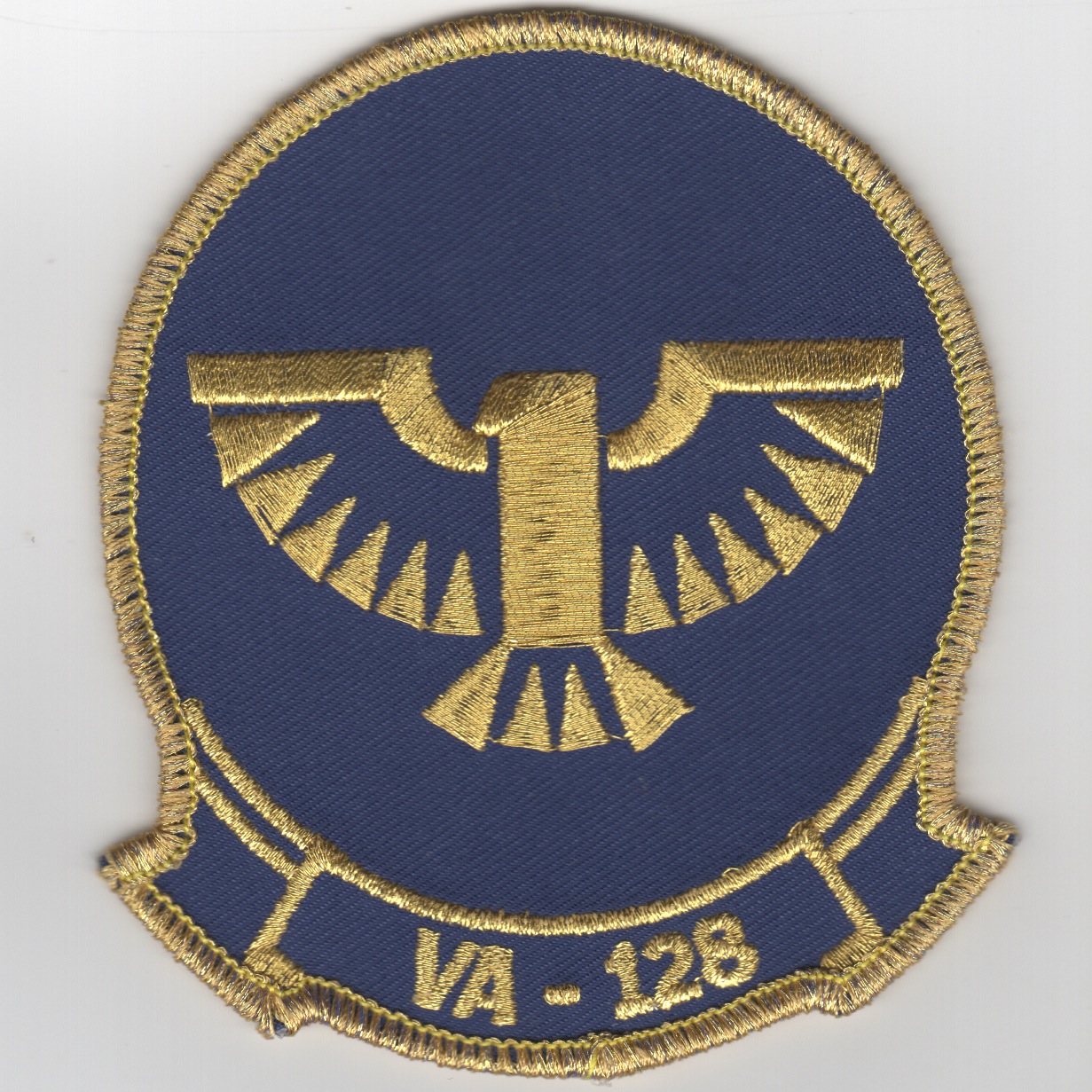 This is the blue version of the squadron patch that depicts a bird with outstretched wings. This bird is a phoenix who, in ancient mythology, was consumed by fire and resurrected from its own ashes. As VA-128 was created from VAH-123, in 1967 the new A-6A Intruder replaced the A-3B Skywarrior as the Navy’s all weather attack bomber. The body of the phoenix in the patch is the number one which symbolizes the first west coast A-6 Intruder operational unit. The color gold is representative of the squadron’s nickname, “The Golden Intruders”. It was derived from the color which most aptly describes the mythological phoenix and for the geographical area in which our squadron aircraft operate, “The Golden West”. The color also represents the squadron’s product, i.e., the replacement flight crews and maintenance personnel, which were literally “worth their weight in gold” to the U.S. Navy’s aerial offensive striking arm, in peacetime or at war. When VA-128 disestablished in 1995, the squadron patch was transferred to the Wing commander. In 1997 it was given to an newly formed EA-6B Electronic Warfare Squadron – VAQ-128. This patch does not come with velcro attached.