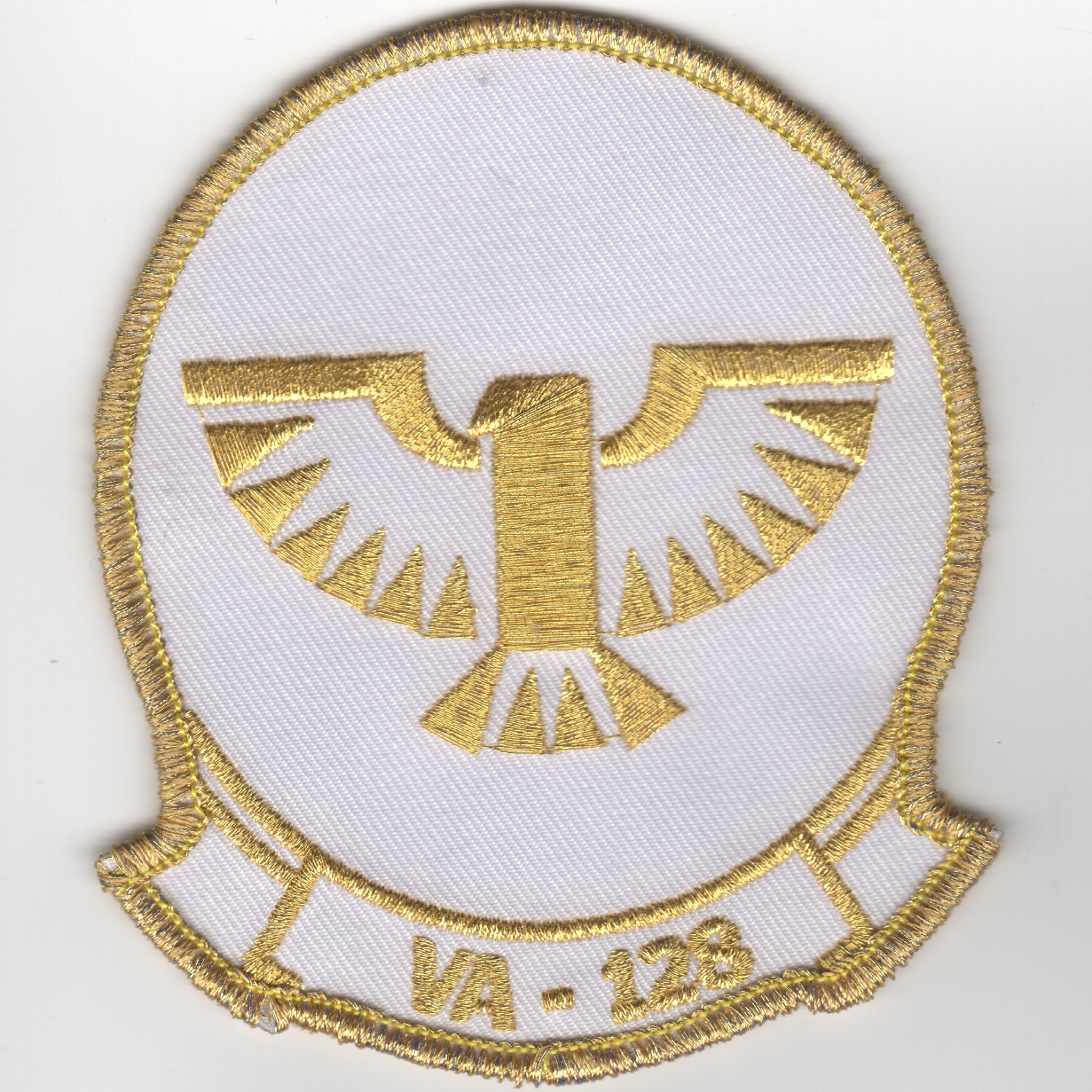 This is the white version of the squadron patch which depicts a bird with outstretched wings. This bird is a phoenix who, in ancient mythology, was consumed by fire and resurrected from its own ashes. As VA-128 was created from VAH-123, in 1967 the new A-6A Intruder replaced the A-3B Skywarrior as the Navy’s all weather attack bomber. The body of the phoenix in the patch is the number one which symbolizes the first west coast A-6 Intruder operational unit. The color gold is representative of the squadron’s nickname, “The Golden Intruders”. It was derived from the color which most aptly describes the mythological phoenix and for the geographical area in which our squadron aircraft operate, “The Golden West”. The color also represents the squadron’s product, i.e., the replacement flight crews and maintenance personnel, which were literally “worth their weight in gold” to the U.S. Navy’s aerial offensive striking arm, in peacetime or at war. When VA-128 disestablished in 1995, the squadron patch was transferred to the Wing commander. In 1997 it was given to an newly formed EA-6B Electronic Warfare Squadron – VAQ-128. This patch does not come with velcro attached.