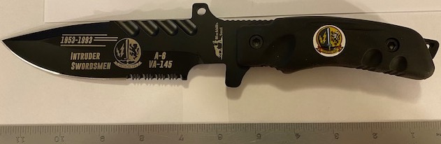 This is the VA-145 SWORDSMEN “BOOT-KNIFE” now available in VERY limited quantities!!! It has the squadron logo and info on the blade, comes with a metal “cloisonne” built into the handle, and has the black sheath and strap. Get them while they last!