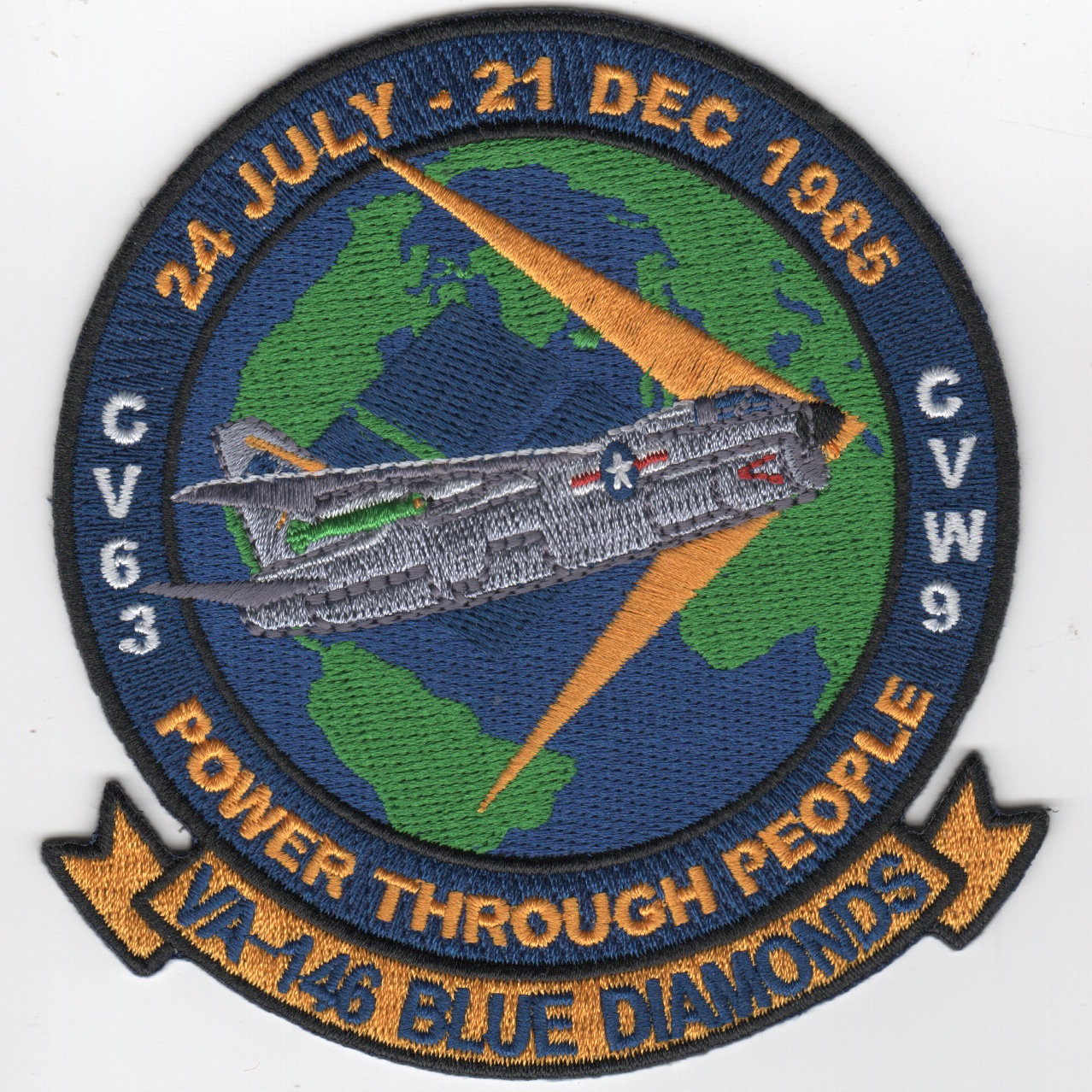 This is the VA-146 “”””Blue Diamonds”””” cruise patch that says “”””Power Through People”””” while onboard CV-63 as part of CVW-9. The dates say 24 July – 21 Dec 1985 and shows the A-7 Corsair over the Atlantic Ocean. This is a reproduction patch and does not come with velcro attached.