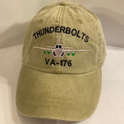 Ballcap: VA-176 frontal view of a loaded A-6 INTRUDER (Khaki/ Directly Embroidered onto the cap) with the lettering in yellow above and below the plane. This cap has an adjustable leather strap.