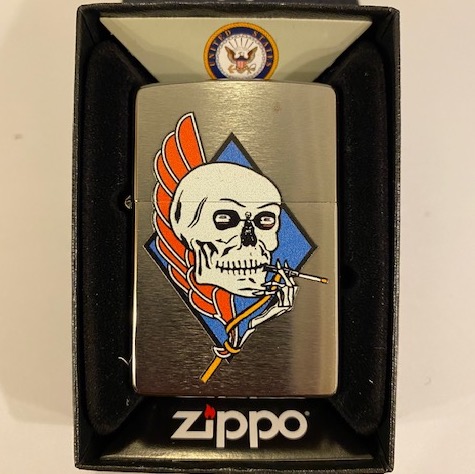 This is the chrome-finish squadron Zippo created for the VA-34 Blue Blasters when they operated with the A-6 Intruder. This version shows the “”””SKULL”””” mascot logo on the front.