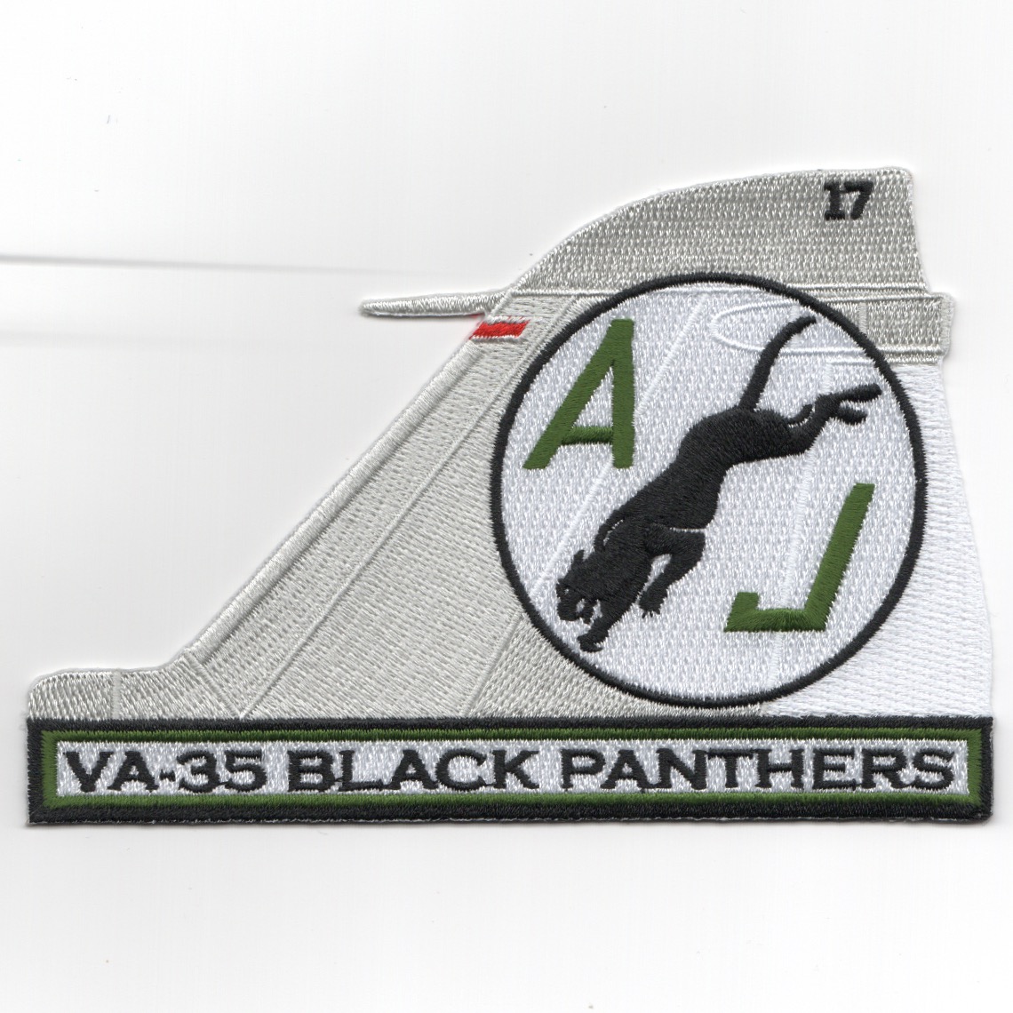 (Another AV8RSTUFF Creation): This is the gray version of the A-6 Tail fin with the ‘AJ’ Tail code for the VA-35 Black Panthers that flew the A-6E Intruder out of NAS Oceana, VA. They were one of the oldest squadrons in the Navy, having had the Panther emblem since the mid-1930’s. This squadron was the one that lost an Intruder the first night of the 1991 Persian Gulf War. This patch does not come with velcro attached.