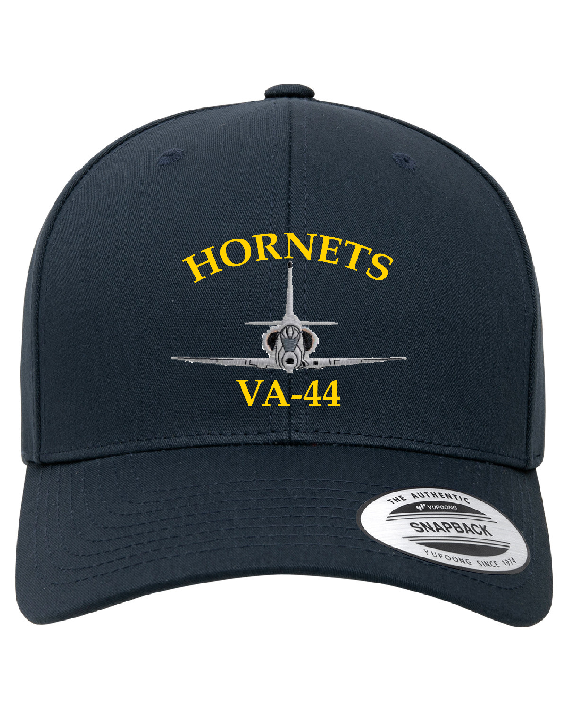 This is the dark blue version of the VA-44 *HORNETS* Douglas A-4 Skyhawk squadron Ballcap that has the aircraft, squadron designator, and squadron callsign embroidered directly onto the front and has a plastic strap on the back for adjusting.