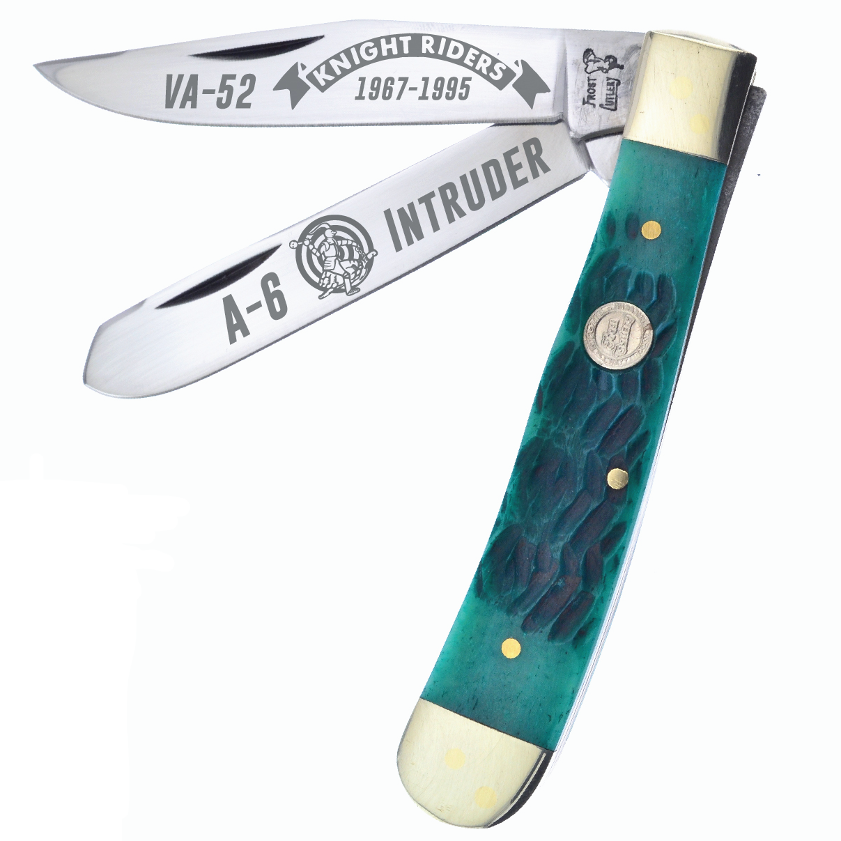 This is the 2-bladed, green-colored, bone handle KNIFE with the shown artwork laser-etched onto each blade. It comes in the box shown below.