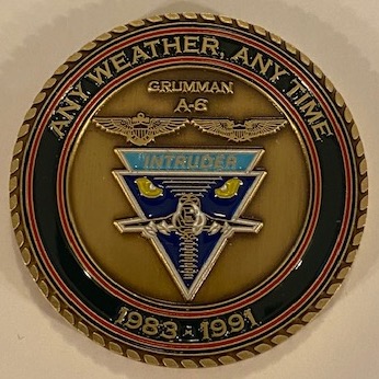 Another AV8RSTUFF creation: This is the VA-55 WAR HORSES Intruder ‘Challenge Coin’ with the Squadron logo on the front and the A-6E Intruder info/logo on the back.